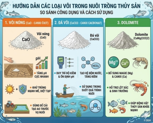 Mỗi loại vôi có đặc tính và mục đích sử dụng khác nhau, phù hợp với từng giai đoạn của quá trình nuôi.